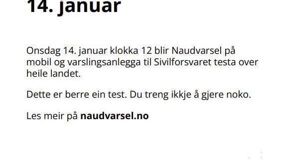 Varslingsprøve - Nødvarsel Onsdag 14. januar klokken 12 testes Nødvarsel på mobil og Sivilforsvarets varslingsanlegg over hele Norge i en felles nasjonal varslingsprøve.