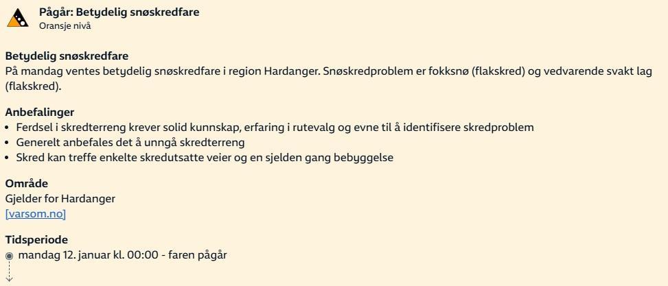 Meteorologisk institutt melder i dag om betydelig snøskredfare, orange nivå, for region Hardanger hvor Sauda inngår.