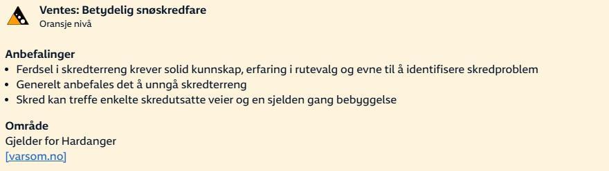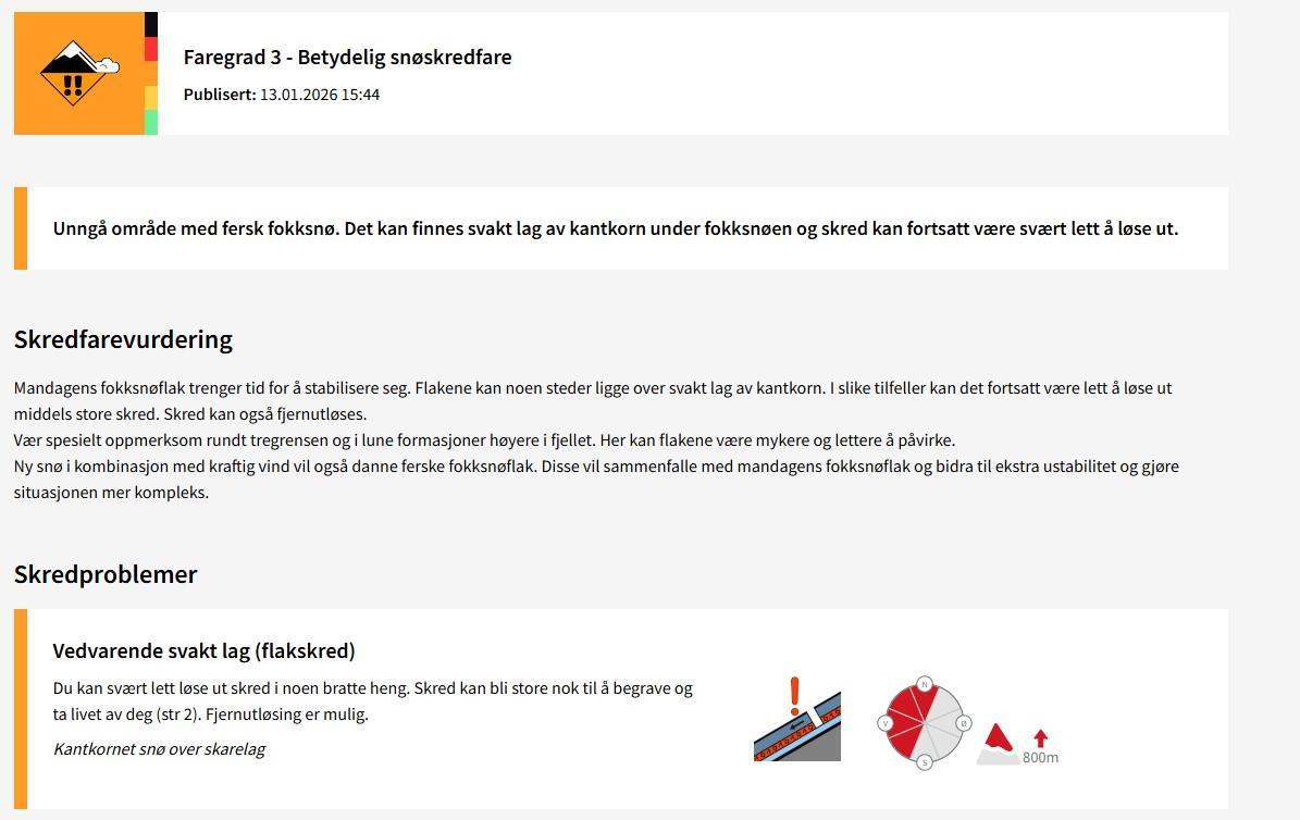 Betydelig snøskredfare i vårt område!Lytt til tekstenStopp avspillingMeteorologisk institutt melder om betydelig snøskredfare i vårt område i hvert fall onsdag og torsdag! Publisert 14.01.2026 08.57 Sist endret 14.01.2026 14.28