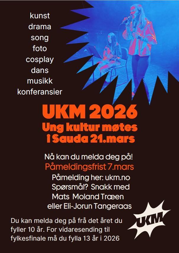 Påmelding UKM 2026!Lytt til tekstenStopp avspillingHar du et talent? Mellom 10 og 20år? Meld deg på!ukm ukm Publisert 11.02.2026 08.01 Sist endret 11.02.2026 08.03
